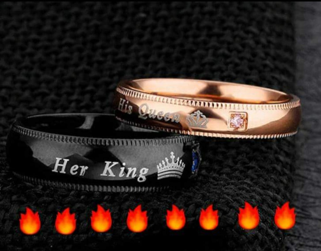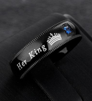 Anillos de acero inoxidable con diseño "HER KING / HIS QUEEN" exclusivamente para reyes y reinas del amor. Incorporados con piedras de circonio azul y rosa.